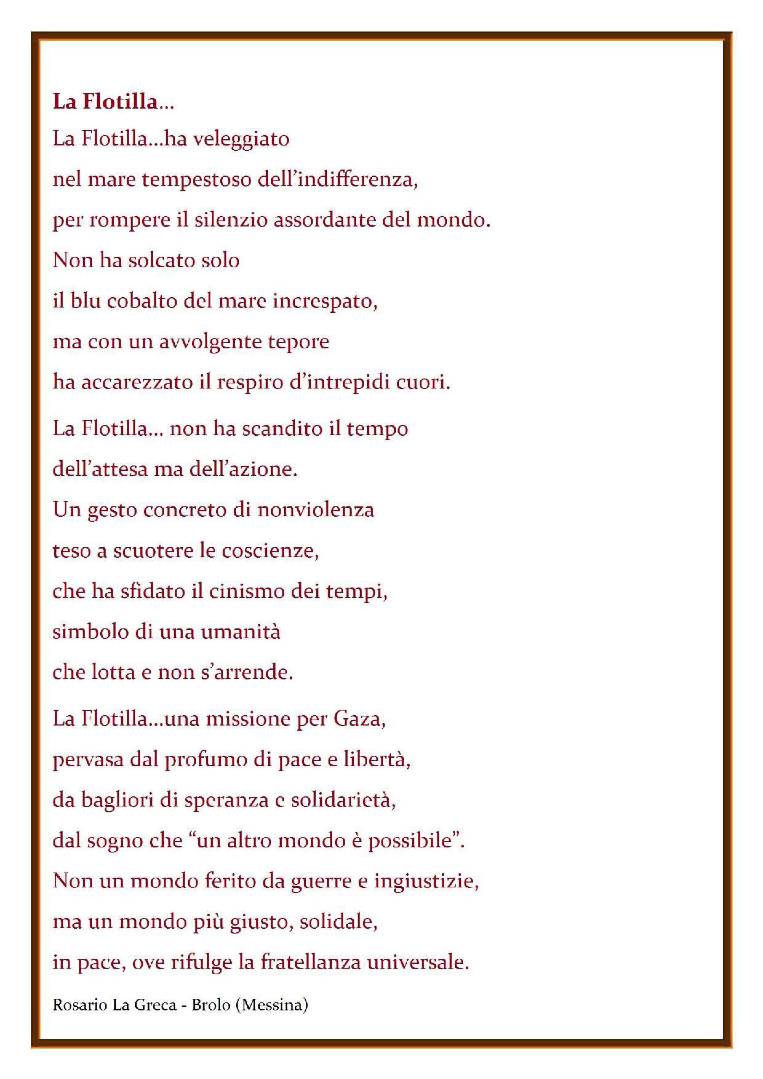in questi giorni, il poeta Rosario La Greca di Brolo (Messina) ha composto la poesia “La Flotilla”, ha il piacere di condividerla con tutti. Il testo della poesia nella foto di copertina