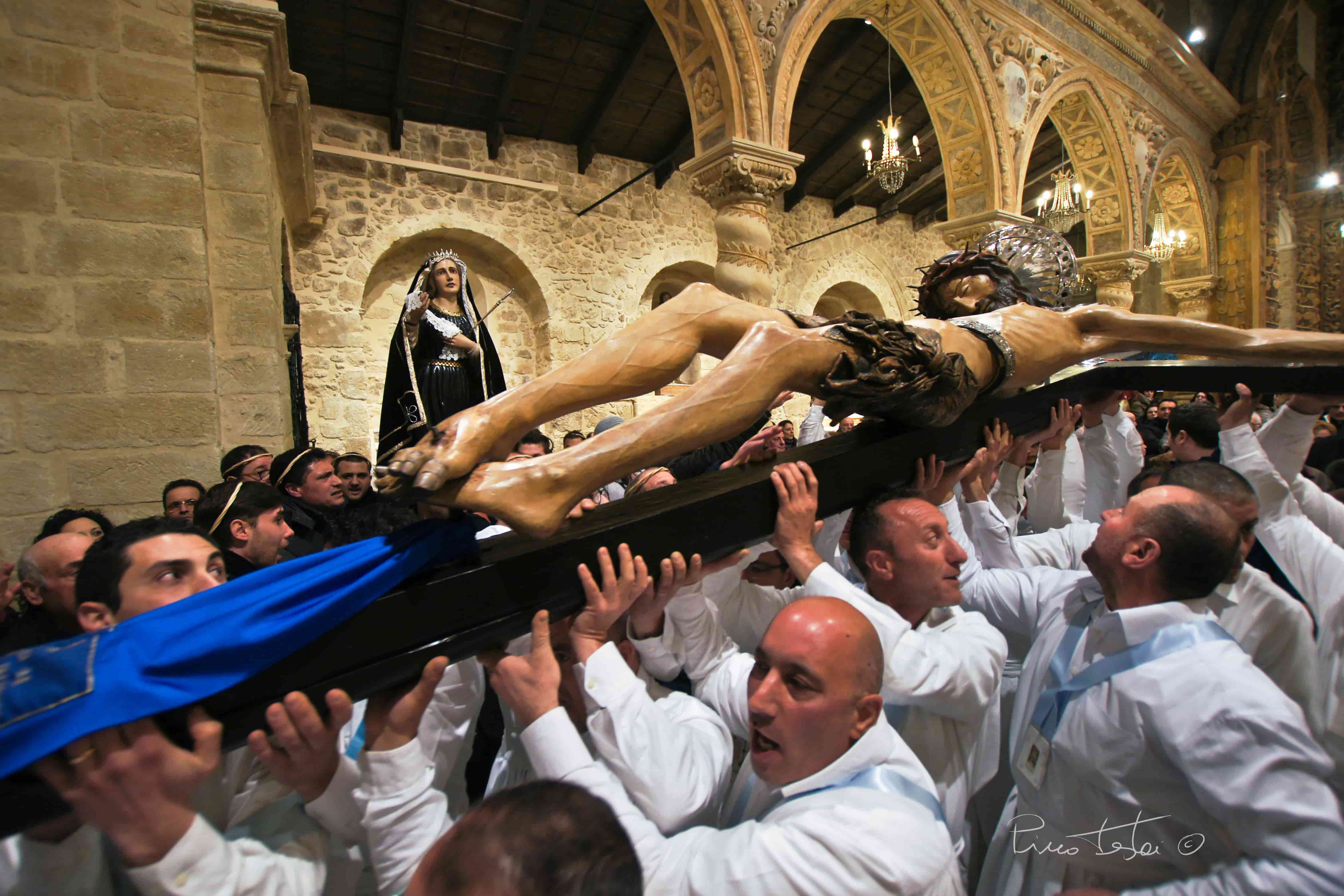 Processione del Cristo Morto: La statua di Gesù in croce, accompagnata dalla Vergine Addolorata, attraversa le vie del borgo illuminate da torce e candele, creando un’atmosfera di silenzio e devozione.