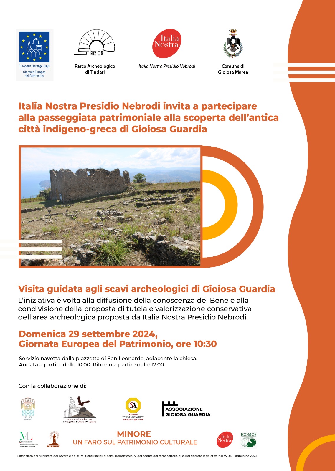 L’iniziativa di domenica 29 settembre, organizzata da Italia Nostra Presidio Nebrodi, è stata patrocinata dal Parco Archeologico di Tindari e dal Comune di Gioiosa Marea e si avvale della collaborazione delle Associazioni Gioiosa Guardia, Pro Loco di Gioiosa Marea, PFM e Sicilia Antica.