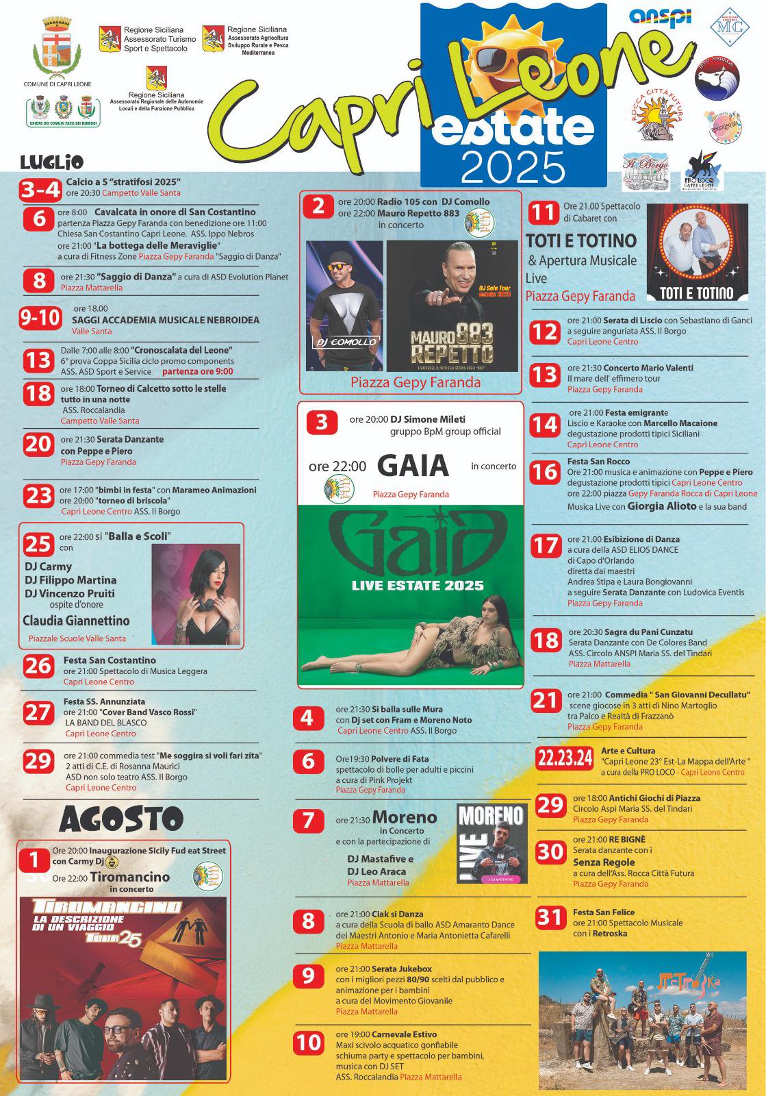 L’estate a Capri Leone si preannuncia all’insegna di un cartellone di manifestazioni davvero ricco e variegato, capace di coinvolgere tutta la comunità e i visitatori con un mix di musica, spettacoli, danza, arte e sapori tipici del nostro territorio.