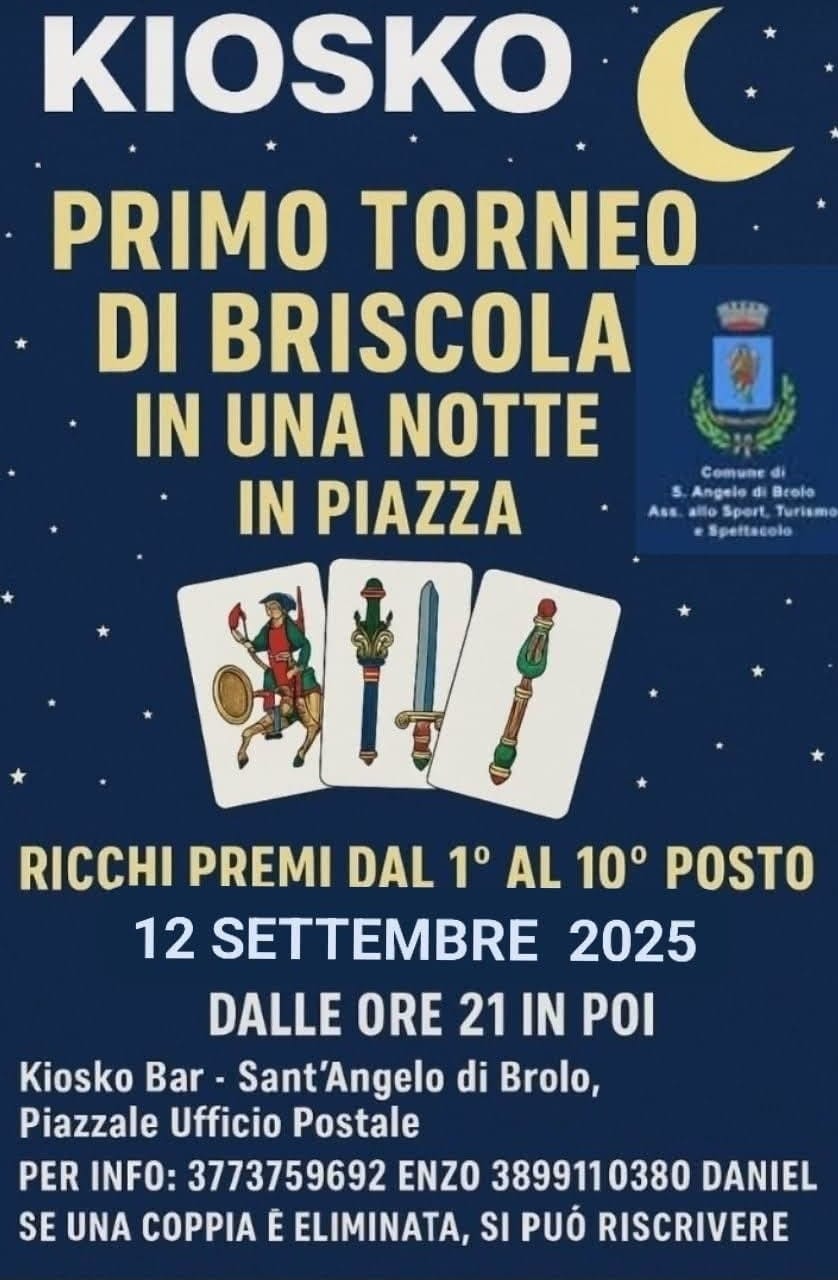 Si svolgerà a Sant'Angelo di Brolo il primo Torneo di Briscola in una notte. Appuntamento venerdì 12 settembre. Sarà una serata davvero speciale, ricca di energia e divertimento, con premi interessanti per i partecipanti. Appuntamento presso Il Kiosco Bar presso il Piazzate Ufficio postale.