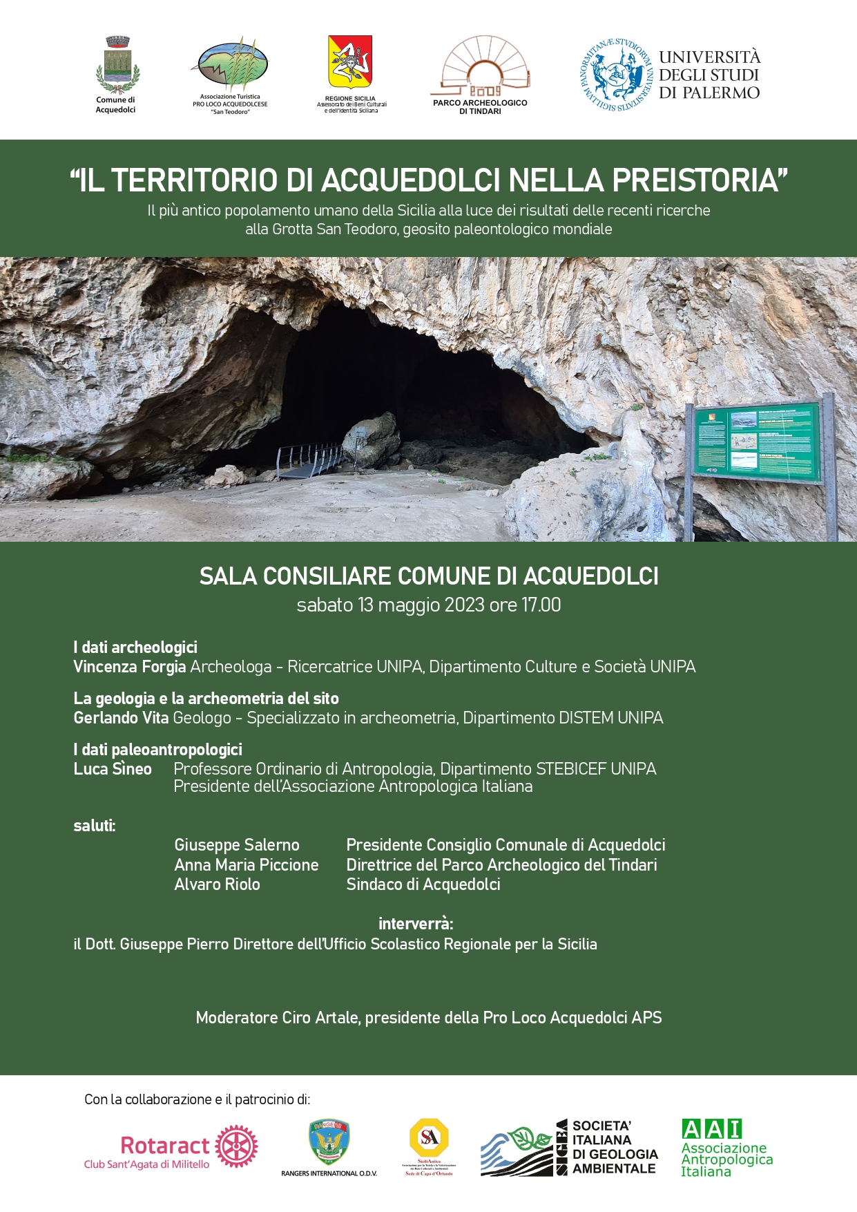 Si svolgerà sabato 13 maggio ad Acquedolci un interessante Convegno sulla Grotta di San Teodoro. L'evento, dal titolo IL TERRITORIO DI ACQUEDOLCI NELLA PREISTORIA, si terrà nell'aula consiliare del comune tirrenico, e vedrà la partecipazione, in veste di relatori, di alcuni studiosi che in estate realizzeranno la loro terza campagna di scavi nel geosito paleontologico mondiale. Il prof. Luca Sìneo, l'archeologa Vincenza Forgia ed il geologo Gerlando Vita interverranno per illustrare, ognuno per la propria competenza, il più antico popolamento umano della Sicilia alla luce dei risultati delle loro recenti ricerche alla Grotta San Teodoro.