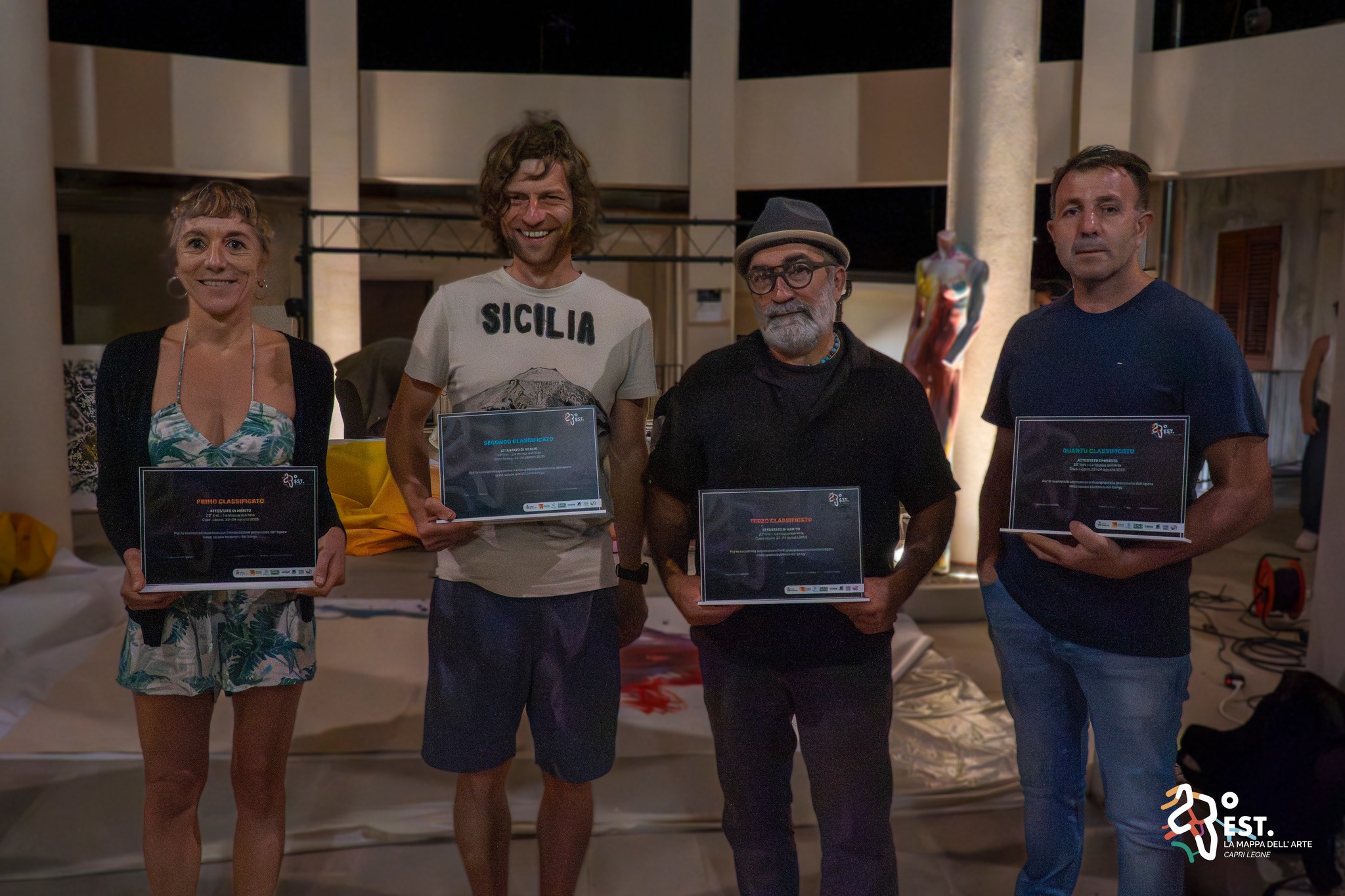 Per tre giorni, dal 22 al 24 agosto, il borgo di Capri Leone si è trasformato in un palcoscenico a cielo aperto, accogliendo artisti e visitatori provenienti da tuta Italia e da diversi paesi d’Europa. Strade, piazze e cortili si sono riempiti di colori, suoni e installazioni, creando un’atmosfera vibrante e coinvolgente che ha reso unico il debuto del festival “Capri Leone_23° Est – La Mappa dell’Arte”. La manifestazione ha rappresentato un nuovo modello di incontro tra arte e territorio, dove le espressioni artistiche più diverse, scultura, pittura, installazioni, performance, musica, design e arti digitali, hanno trovato spazio in un dialogo aperto con la comunità e con i luoghi storici del borgo.
